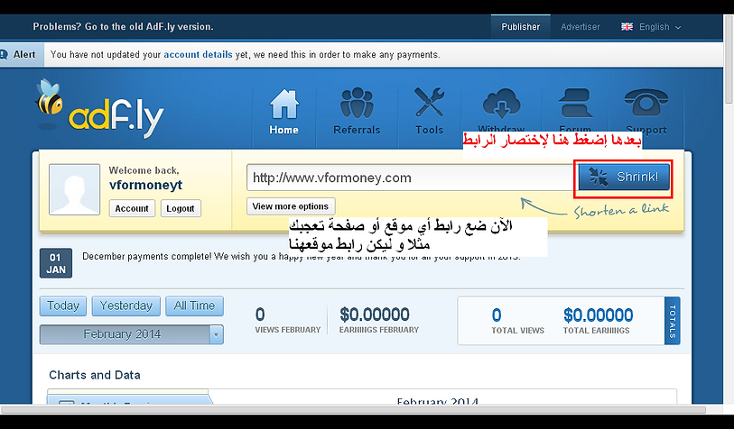 أما بالنسبة لروابط الاحالة (الريفيرال) فستحصل على 20% من الارباح لمدى الحياة على كل من يسجل عن طريقك و5% من أي شخص يقوم بالاستثمار والإعلان في Adf.ly إن كان مسجل عبر رابط الإحالة الخاص بك